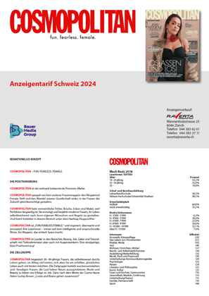 ...ist die weltweit bekannteste Premiummarke, erscheint mit 53 Ausgaben in 79 Ländern und ist mit rund 42 Millionen Leserinnen das grösste Frauen-Magazin der Welt. Das COSMOPOLITAN ist FUN . FEARLESS . FEMALE und inspiriert, überrascht und provoziert ihre Leserinnen – immer auf eine intelligente und anspruchsvolle Weise. Ein Magazin, das einfach Spass macht.